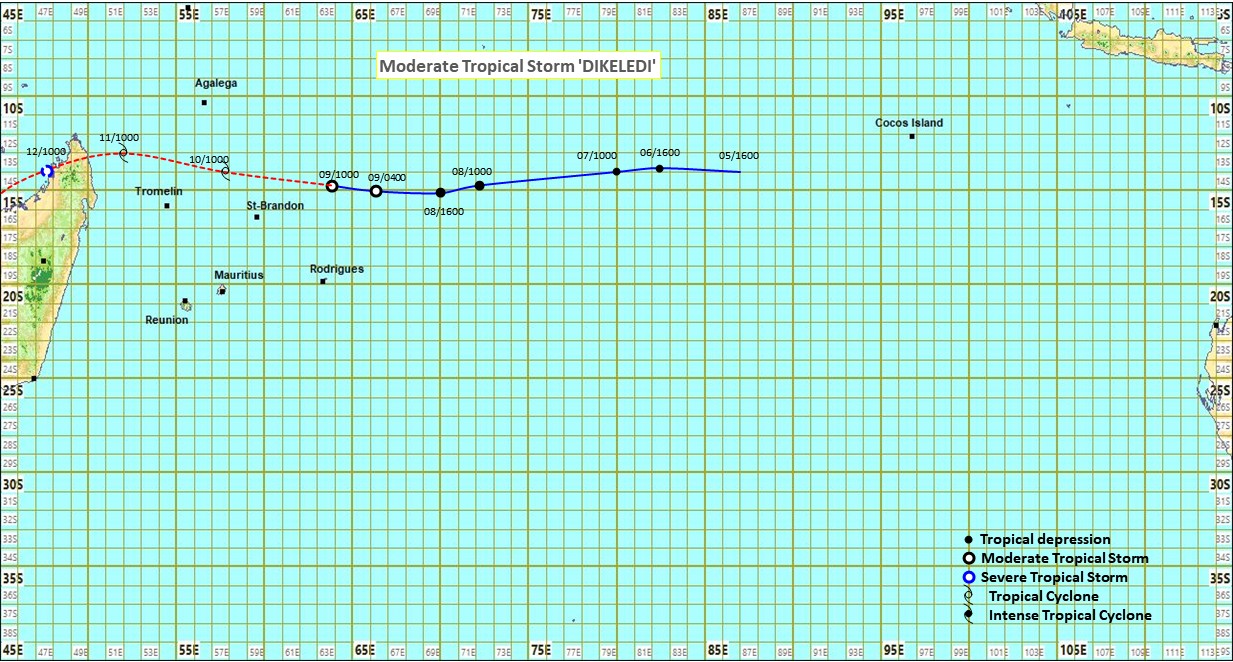 Les services météorologiques ont émis un avertissement de fortes pluies, de vents forts et de fortes houles à St Brandon, en raison de la tempête tropicale modérée DIKELEDI, qui s’est intensifiée pendant la nuit. À 10h00 ce matin, la tempête se trouvait à environ 490 km au nord-est de St Brandon, se déplaçant rapidement vers l’ouest à une vitesse de 35 km/h. Les conditions sont favorables à une intensification supplémentaire de la tempête, qui devrait passer à environ 200 km au nord de l'île dans la nuit, apportant des conditions météorologiques perturbées, avec des averses et des orages.