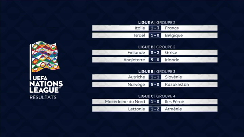8 duels ont été livrés dimanche soir (17 novembre 2024). Ainsi, dans le groupe 2 de la Ligue A, la France est allée battre l’Italie 1–3. De son côté, Israël s’est imposé 1-0 aux dépens de la Belgique. Dans ce groupe, la France et l’Italie verront les quarts de finale. Dans le groupe 2 de la Ligue B, l’Angleterre, déjà qualifiée, a étrillé la République d’Irlande 5-0. Dans le Groupe 3, notez notamment le carton de la Norvège contre le Kazakhstan 5-0. Au classement final, la Norvège termine à la première place et ira en Ligue A. Dans le groupe 4 de la Ligue C, la Macédoine du Nord, invaincue, a battu les Iles Féroé 1-0.